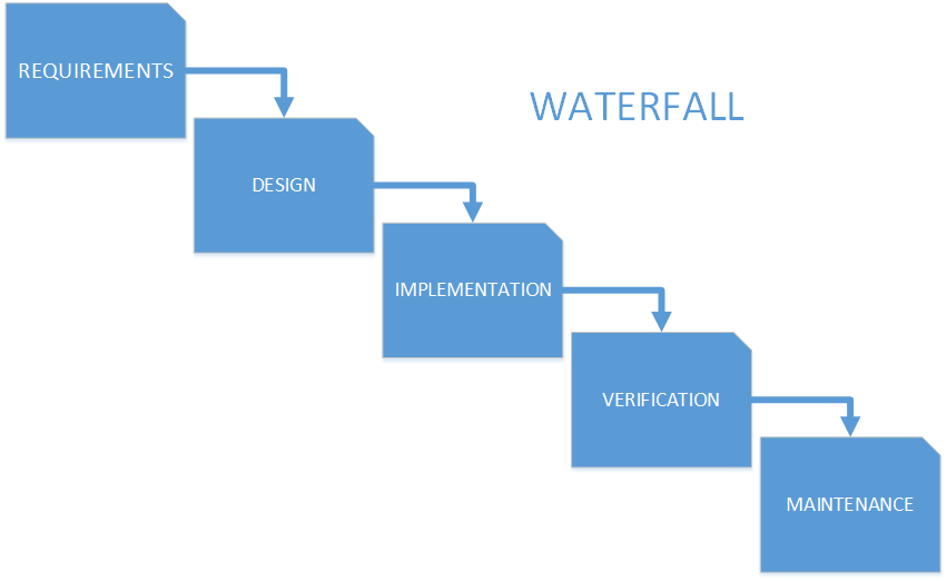 Waterfall is traditional method for software development project. Development moves from concept, through design, implementation, testing, installation, troubleshooting, and ends up at operation and maintenance. Each phase of development proceeds in strict order. (Tutorialspoint)